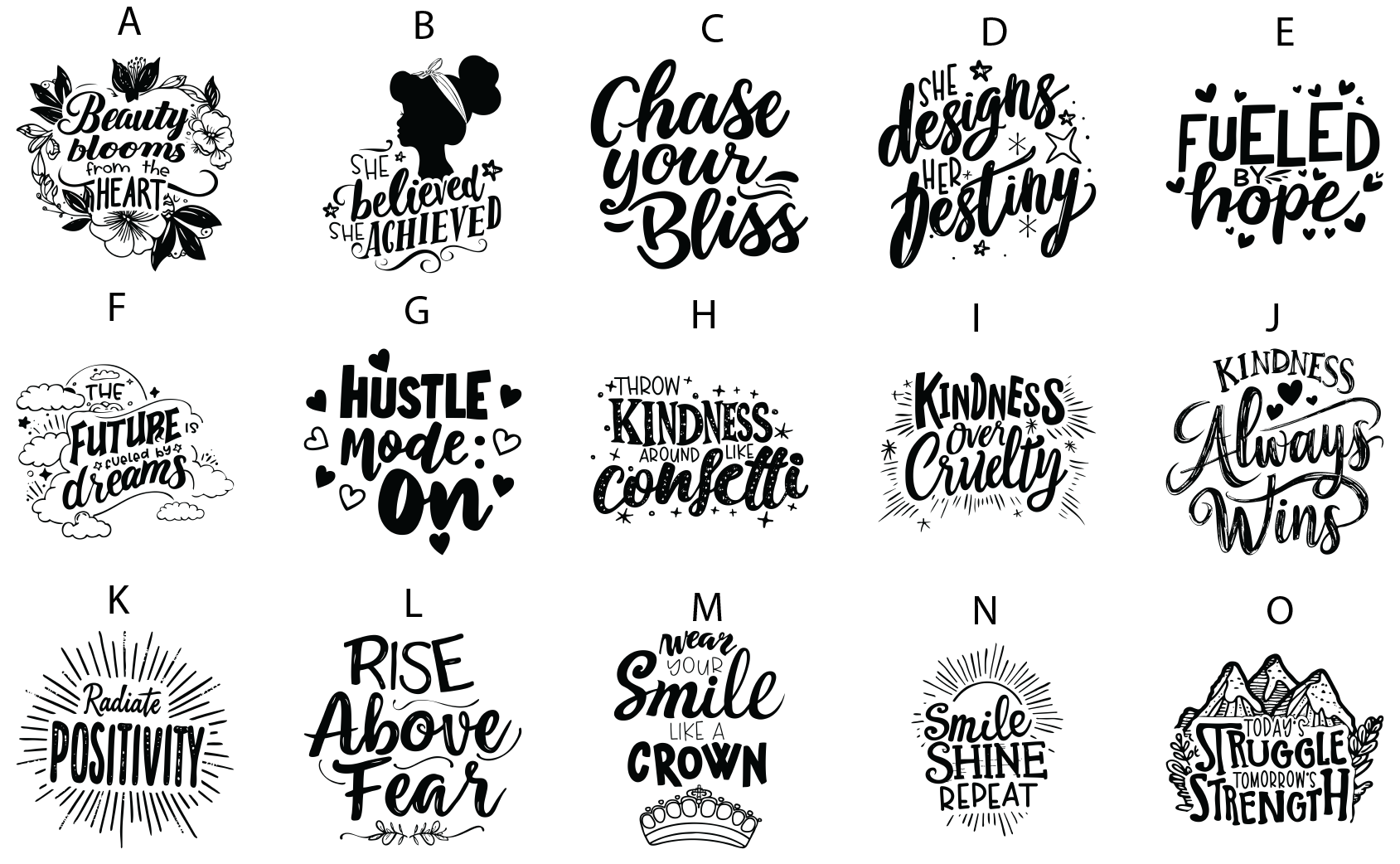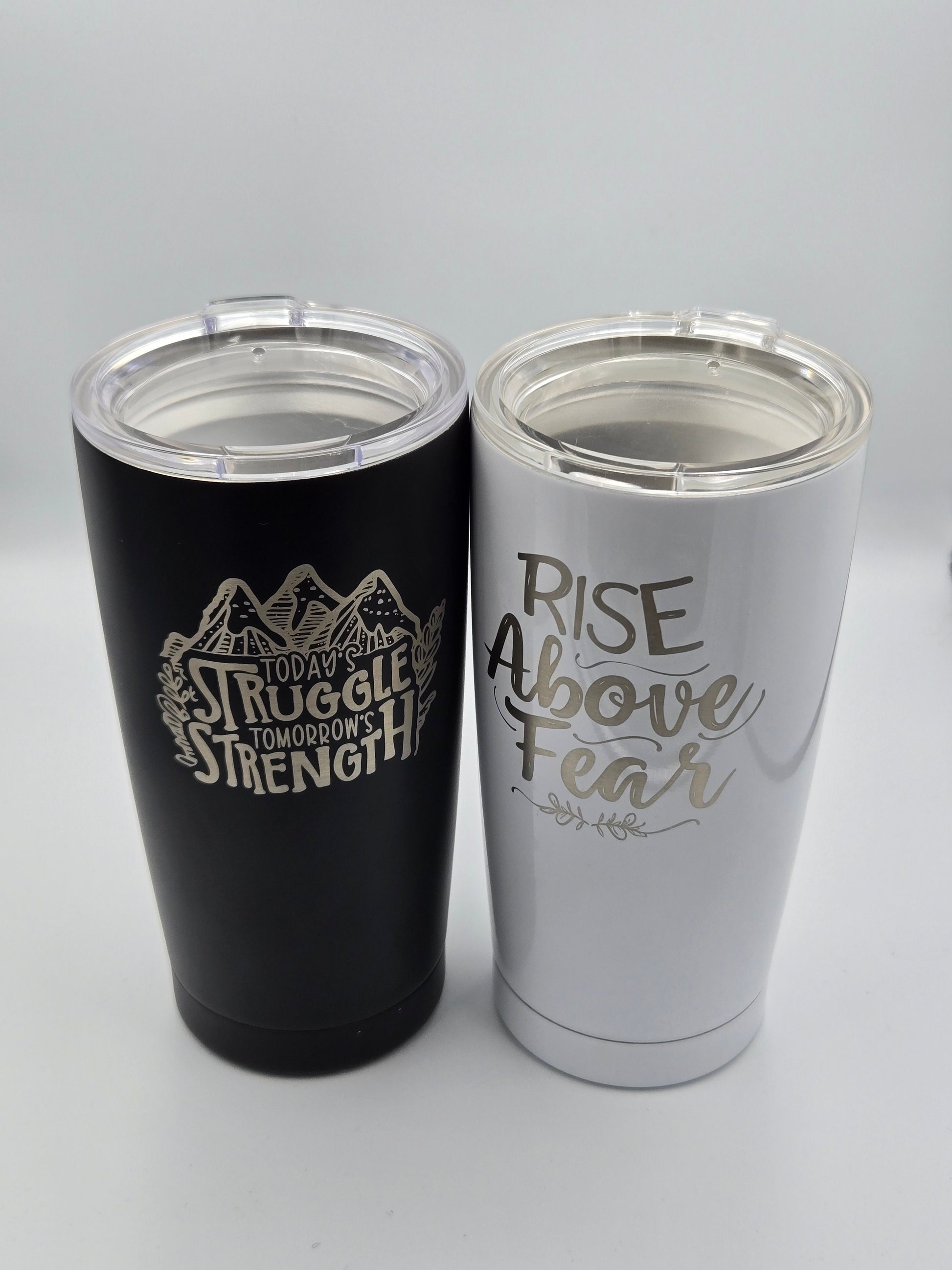 Are you looking for that Special Tumbler that shows something that Inspires? Choose from either a white or black tumbler and a variety of Inspirational Messages. Choose the letter for the design you want and the color of the tumbler and we will take care of the rest!